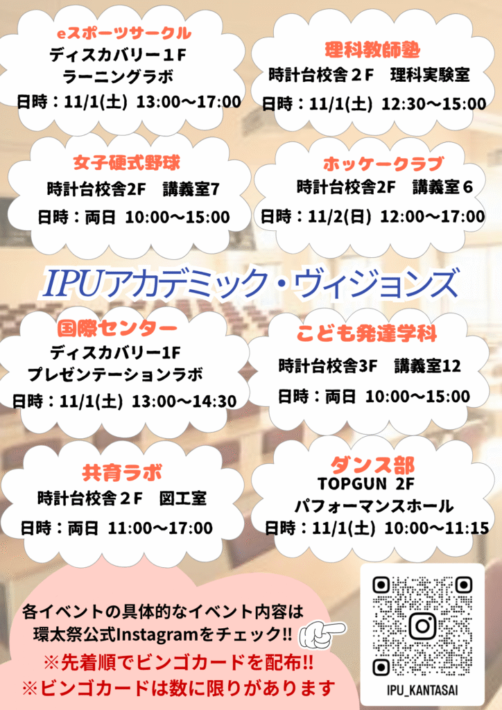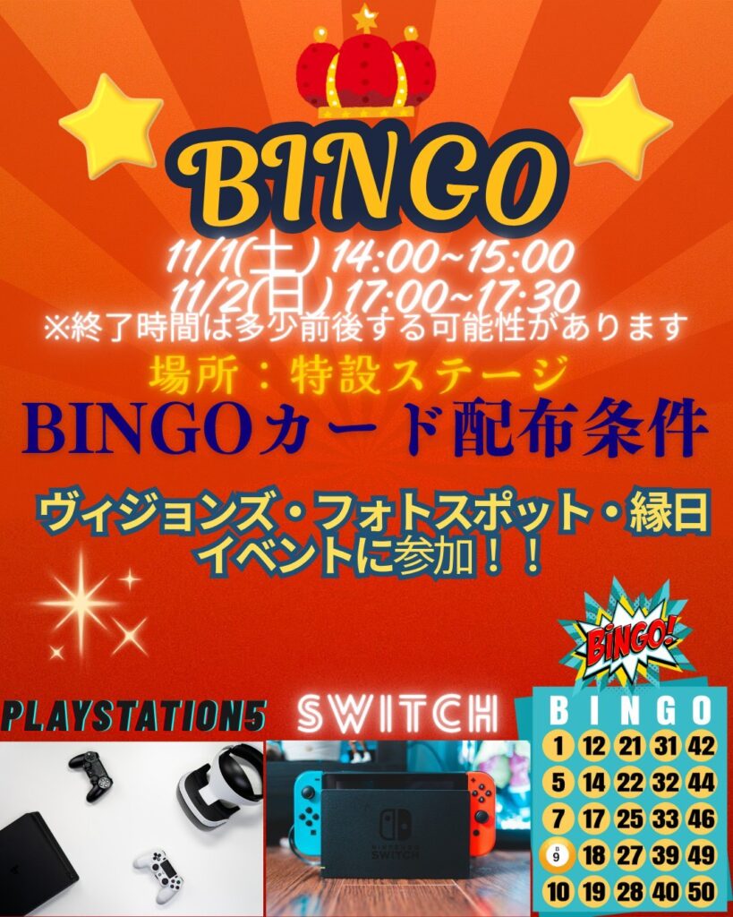 ビンゴ大会では、誰でも楽しめるようなイベントとなっており、PS5や掃除機など豪華景品をご用意しております。 ビンゴカードは、アカデミック・ヴィジョンズ、謎解きクイズラリー、縁日イベントに参加してくださった方に先着順で無料配布させていただきま... -