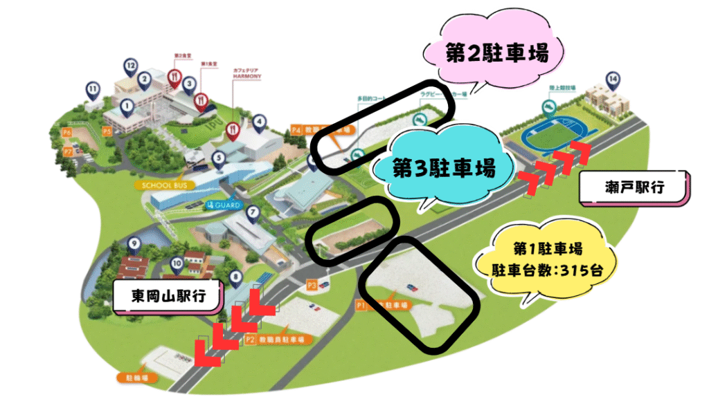- JR山陽本線 東岡山駅(岡山駅から3駅)より15分程度(北口からスクールバス運行中)